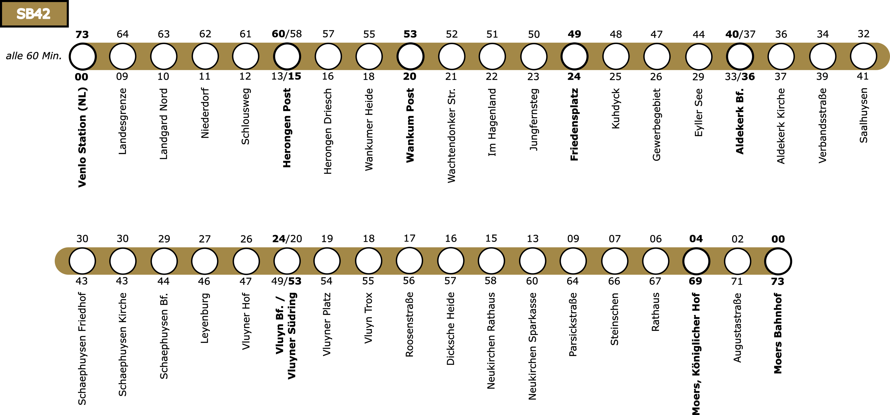 Die SB42 ist eine Linie, die zum 14. Mai 2023 den Betrieb zwischen Herongen, Niederdorf und Aldekerk, Bahnhof aufgenommen hat und zum 21. August 2024 bis nach Venlo verlängert wurde und ist Teil der Schnellbus-Offensive des Kreis Kleve.