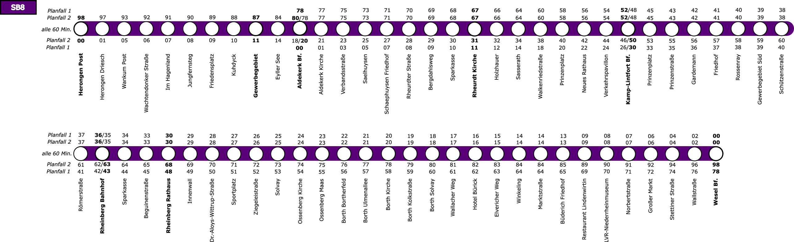 Die Fahrplanlage zwischen Aldekerk und Wesel ist in beiden Fällen (mit oder ohne Verlängerung nach Herongen) gleich. Sie startet um Minute 32 ab Aldekerk in Richtung Wesel, sowie um Minute 09 ab Wesel in Richtung Aldekerk. Die SB8 erfüllt in seiner Strecke gleich verschiedene Aufgaben: