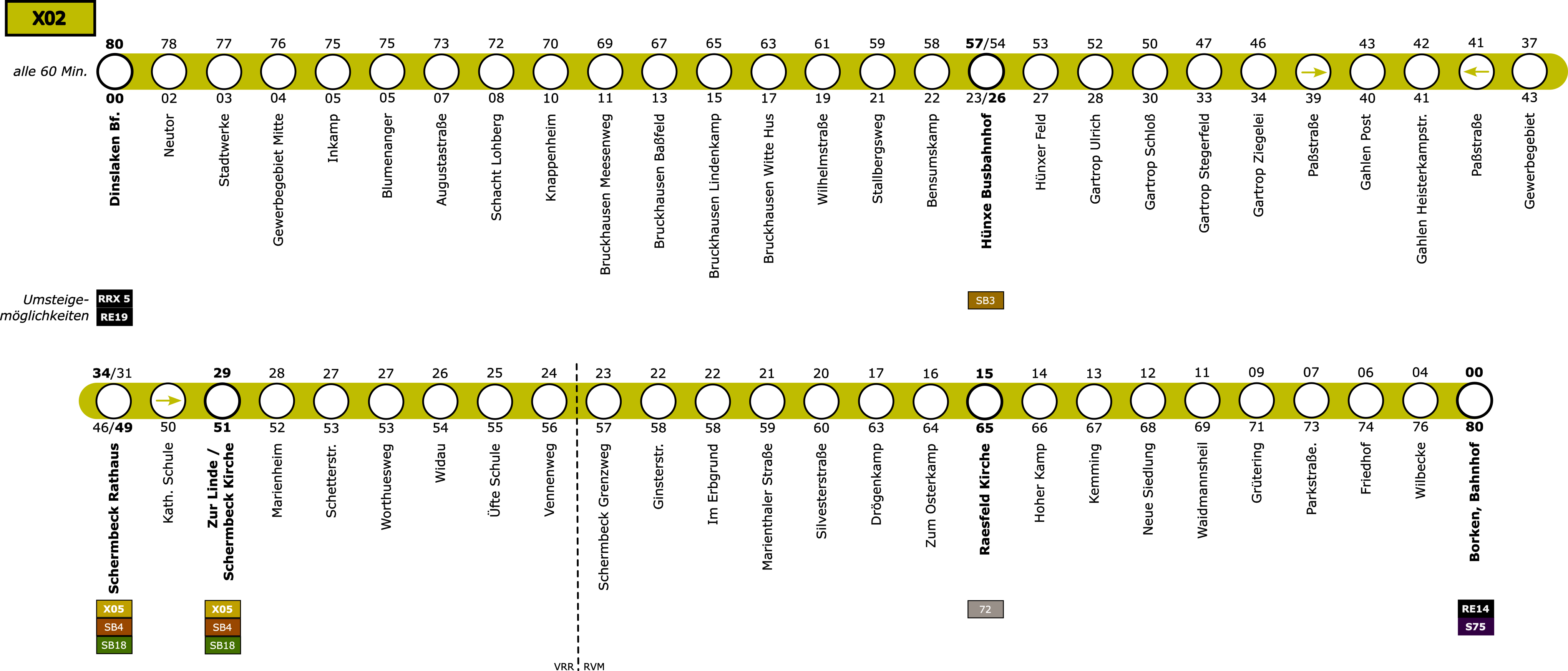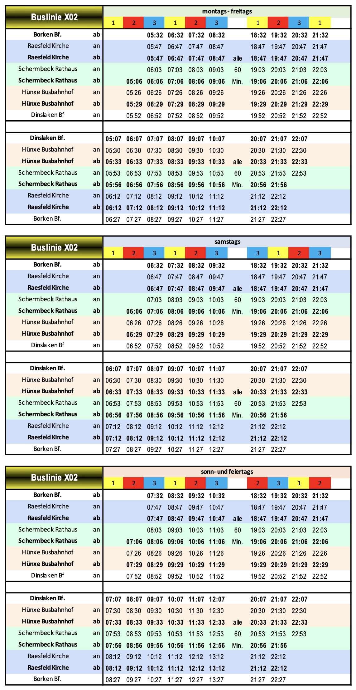 X02 Borken <-> SB4 Wesel Bf. (2 Min. Umsteigezeit) - Zur Linde / Schermbeck Kirche: