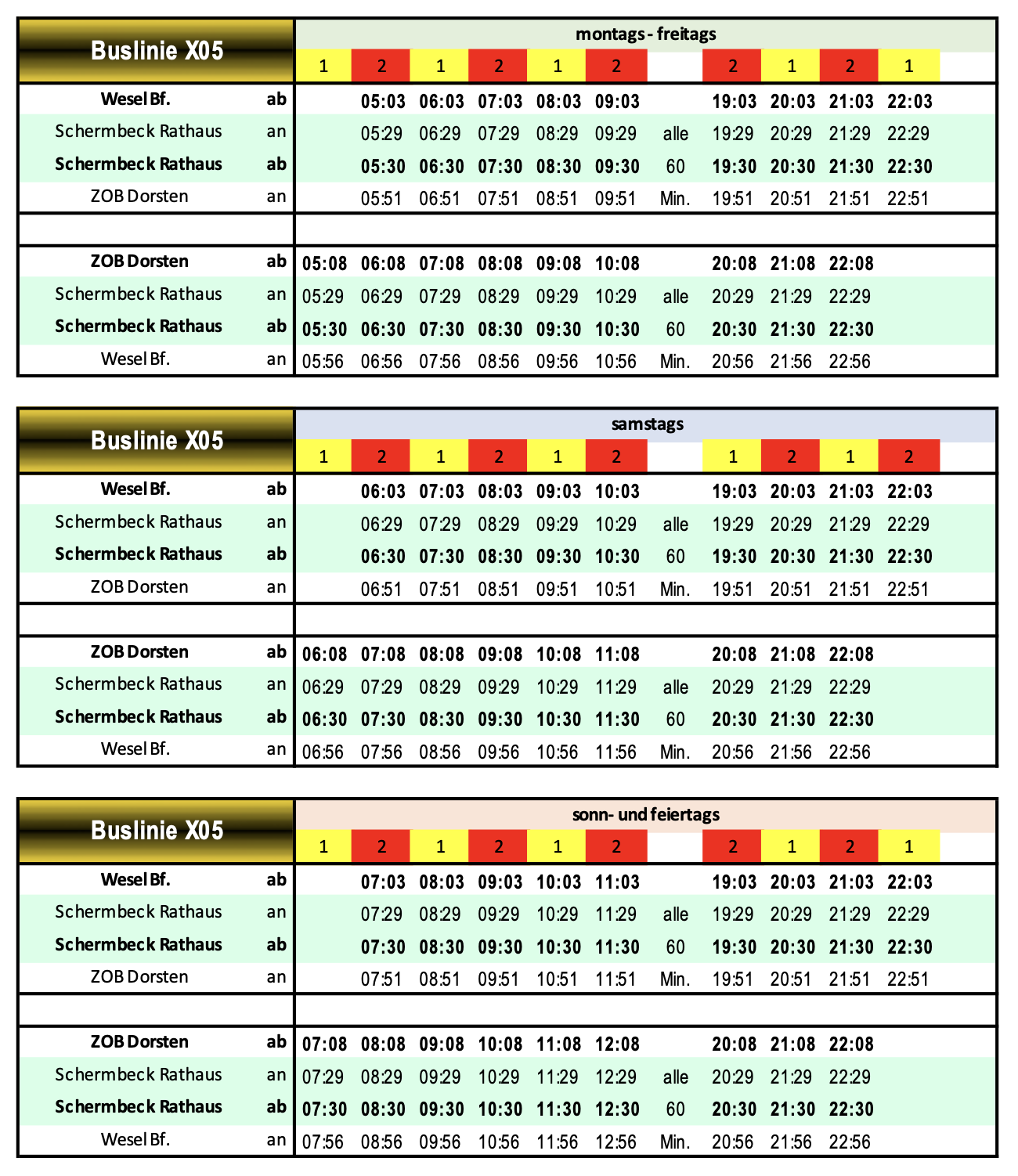 Bei der Buslinie X05 sind weder an der Linienführung noch an der Fahrplanlage oder des Betriebsangebotes Änderungen notwendig. Die aktuell befahrene Fahrplanlage entspricht auch der untersuchten optimalen Fahrplanlage. In Fahrtrichtung Dorsten wurde die Abfahrt ab Wesel um eine Minute vorverlegt, um einen gesetzten einminütigen Halt in Schermbeck durchführen zu können. In die Gegenrichtung wurden die Fahrzeiten zur Symmetrieminute Null (59 1/2) angepasst.