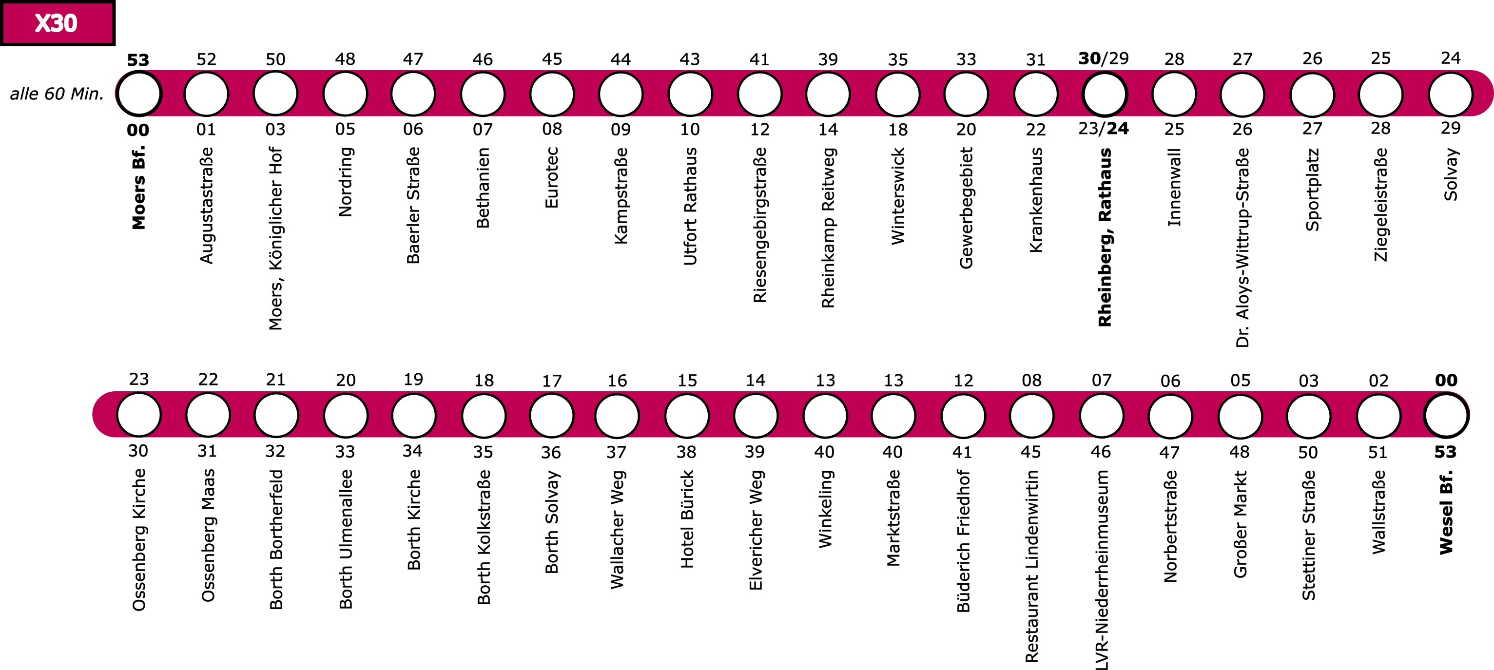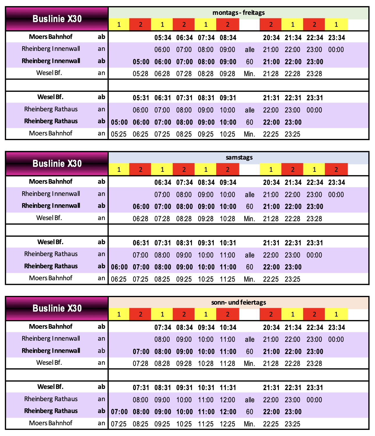 X30 Moers <-> 1 Kamp-Lintfort Bf. (6 min. Umsteigezeit) - Rheinberg, Innenwall